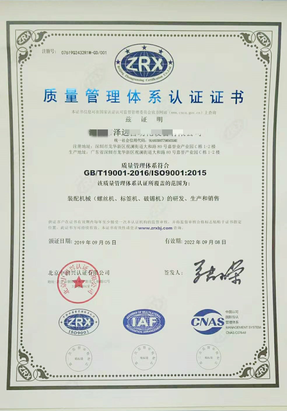 螺絲機(jī)專業(yè)生產(chǎn)廠家已通過ISO9001質(zhì)量管理體系認(rèn)證